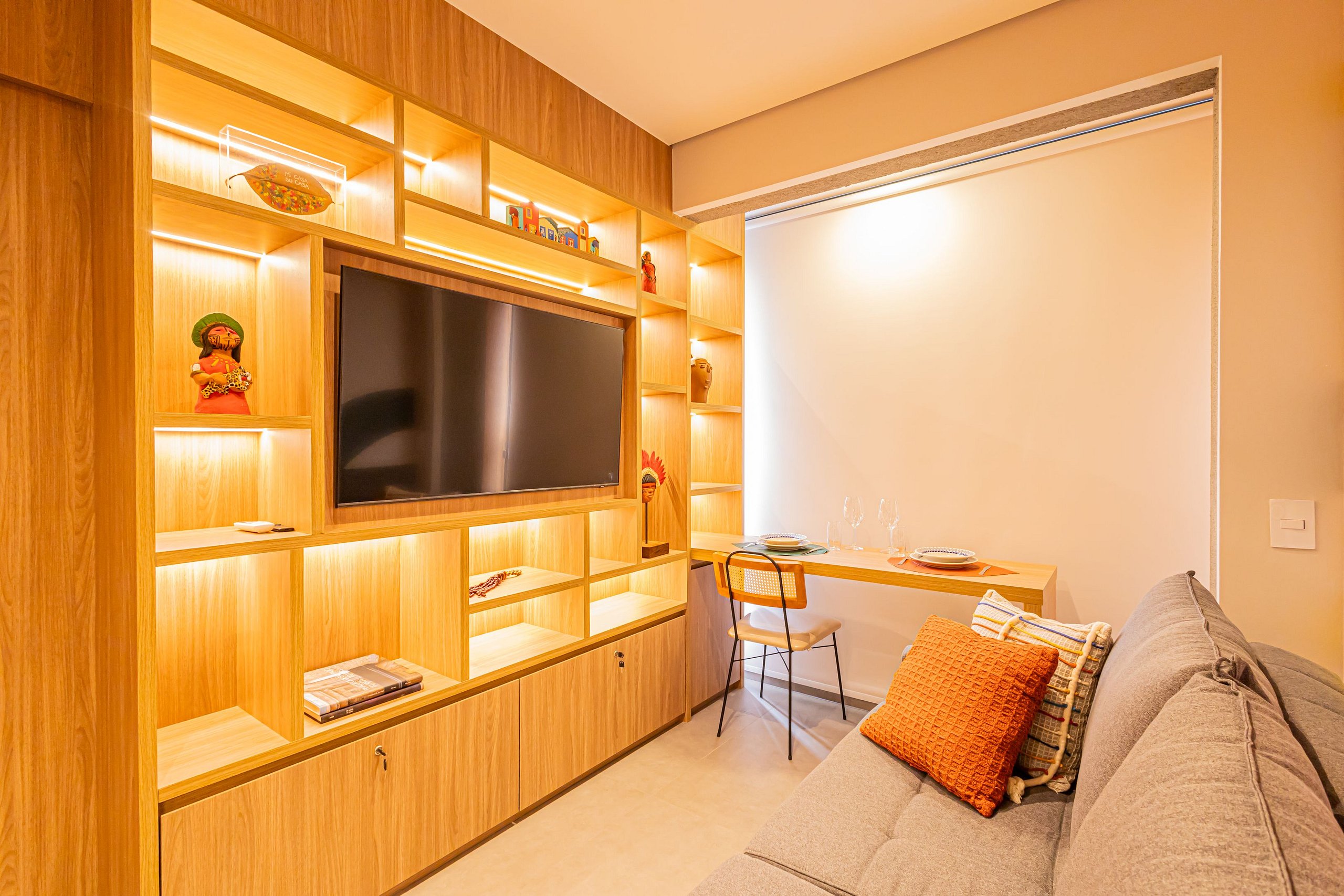 O apartamento comporta duas criancas e dois adultos ou tres adultos. Quarto colorido possui uma cama queen-size, armário aberto, ar condicionado e uma linda varanda. O banheiro moderno apresenta deslumbrantes azulejos amarelos do Athos Bulcão. Na área de estar, uma estante com uma galeria de arte brasileira e uma parede pintada por um artista local valorizam o espaço complementados por um sofá-cama. A cozinha inclui airfryer, micro-ondas, forno, fogão, máquina Nespresso e geladeira.