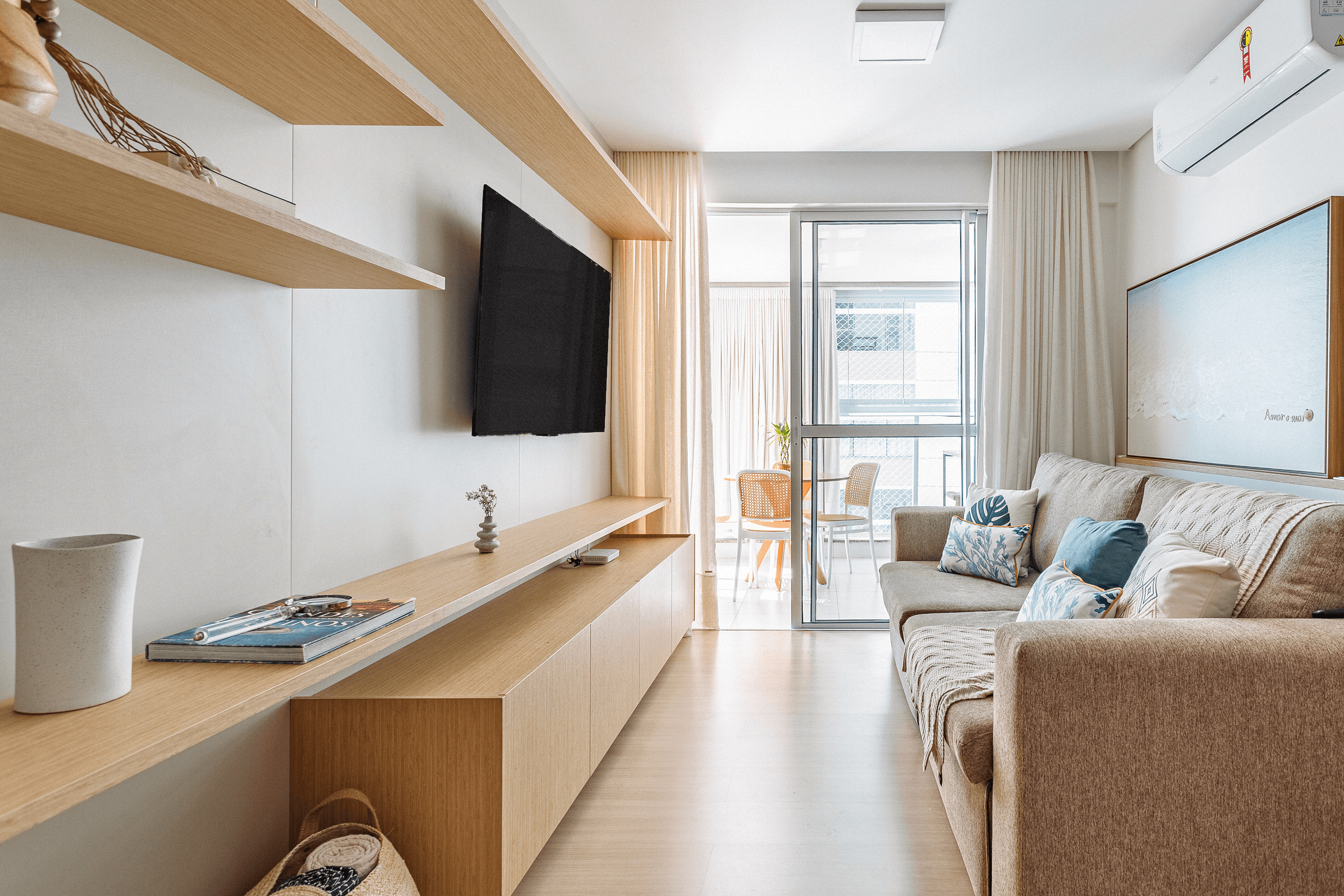 Assinado pelo @estudio.fitto, o apartamento foi planejado para oferecer uma experiência única, com ambientes completos e funcionais. Da cozinha equipada à suíte master com vista lateral para o mar, cada detalhe foi pensado para criar momentos especiais. O condomínio conta com áreas de lazer para todas as idades, priorizando o conforto e bem-estar durante sua estadia.